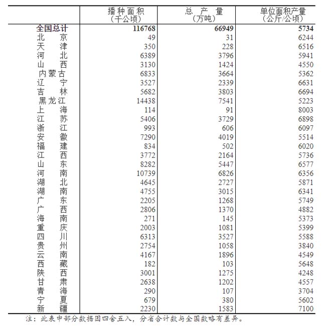 全國(guó)糧食總產(chǎn)量為31個(gè)省(區(qū)、市)夏糧、早稻和秋糧產(chǎn)量的總和。