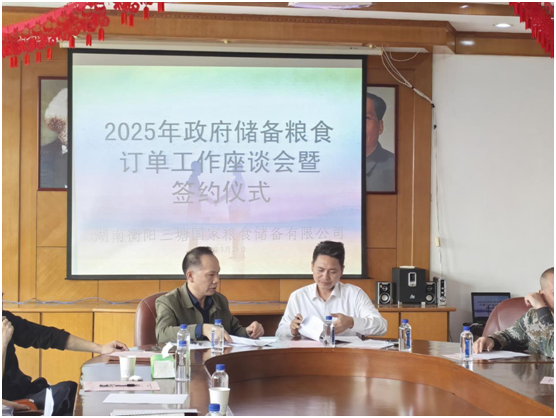 3月26日上午,衡糧集團三塘子公司在三樓會議室組織召開2025年政府儲備糧食訂單工作座談會,邀請了衡南縣、衡陽縣等周邊稻谷實際種植者代表參加洽談并現場簽約。衡陽市發改委調控科科長萬秋香、副科長周鐵鋼,衡糧集團黨委副書記、總經理劉光蘭等出席會議,副總經理尹培劍主持會議,三塘公司中層以上干部參加會議。